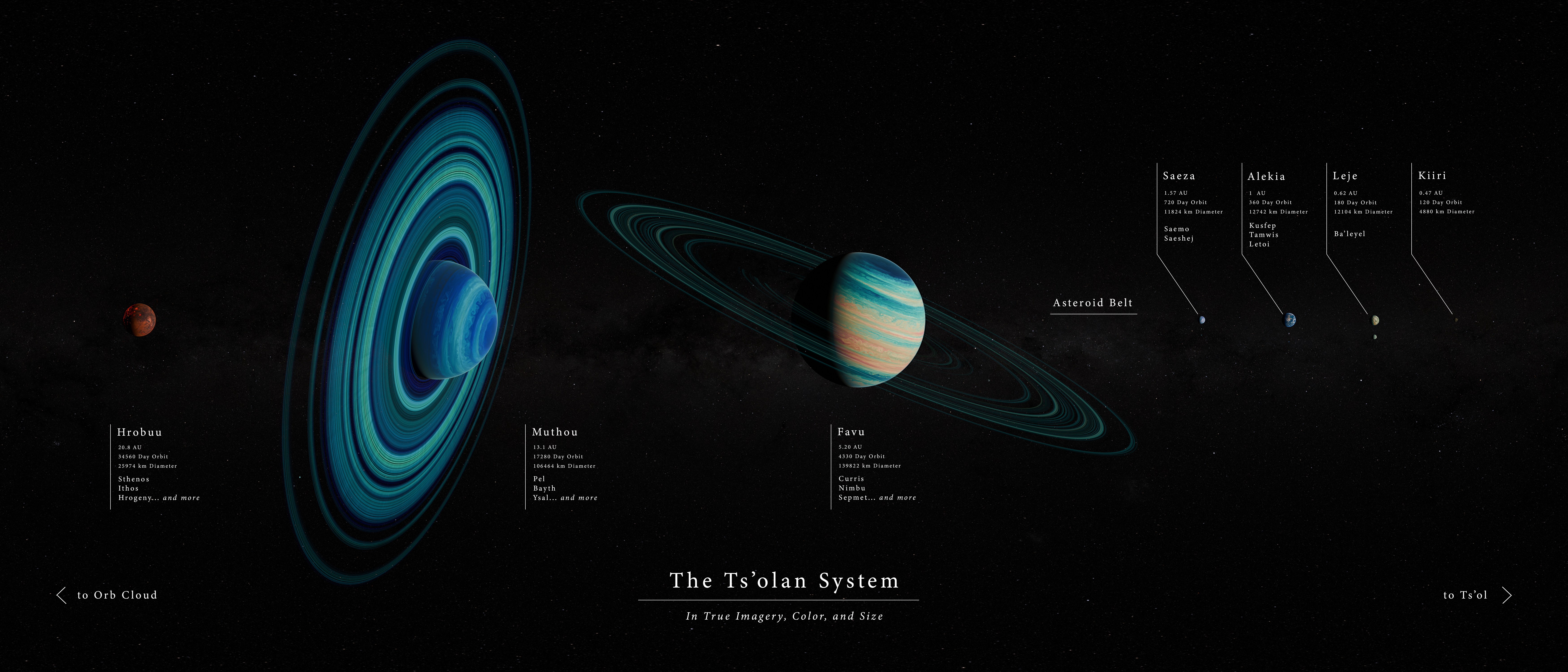 The largest objects to orbit Ts’ol are an asteroid disc field, the hypothesized Orb Cloud, and seven planetary systems. In order from Ts’ol, these seven systems are- the four rocky, Kiiri, Leje with Ba’leyel, Alekia, and Saeza; gas giant, Favu; ice giant, Muthou; and chthonian giant, Hrobuu.
